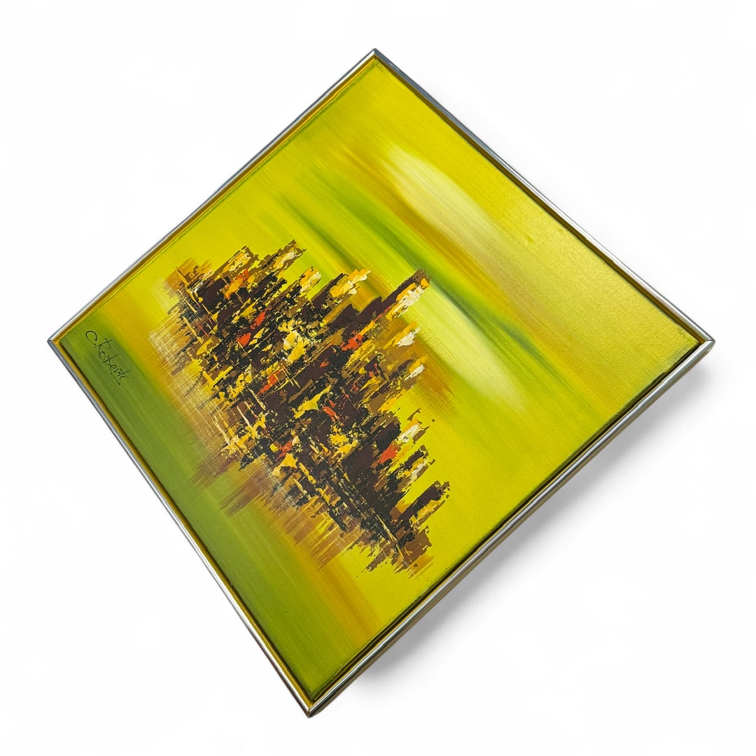 Vintage C. Roberts abstract cityscape oil painting on canvas in a square chrome frame, signed by the artist. This piece features a vibrant yellow-orange and green background with a dark, textured cityscape that appears to reflect on water. The modern aesthetic makes it a striking addition to any contemporary or mid-century inspired decor. Ready to Hang.