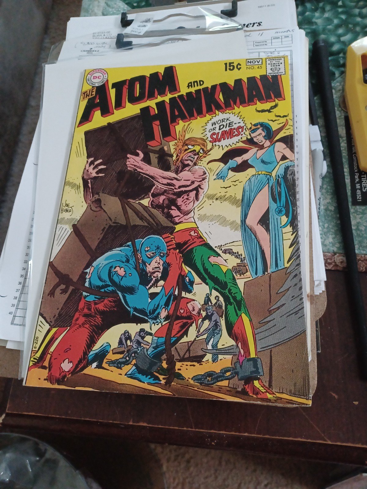 Final issue of the series. Cover by Joe Kubert. "Queen Jean, Why Must We Die?", script by Denny O'Neil, pencils by Dick Dillin, inks by Sid Greene; Jean Loring sees the face of a killer she had unsuccessfully defended on everyone she meets, and goes berserk; Ray Palmer tries to help her, and discovers that his Alpha Energy machine is radiating unusually; He locks Jean in a room, while he investigates the source as the Atom; In doing so, he encounters a tiny armored warrior, and has his arm coated in silver, as well as being irradiated by another Alpha-Ray machine; His only choice is to become large again, whereupon he finds that Jean is gone. Ray calls Carter Hall for help, and they find the armor is the same as that found in Death Valley, apparently left by aliens, so they travel there and find identical alpha emissions; Atom figures that Jean is being held in a sub-atomic world there, and, using his lens-sizer shrinks Hawkman to sub-atomic size.
